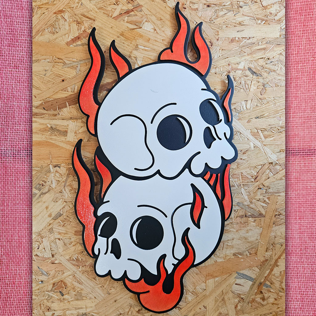 Calaveras Old School pintado a mano, inspirada en el arte del tatuaje. Una pieza artesanal con alma para dar carácter a tu hogar.